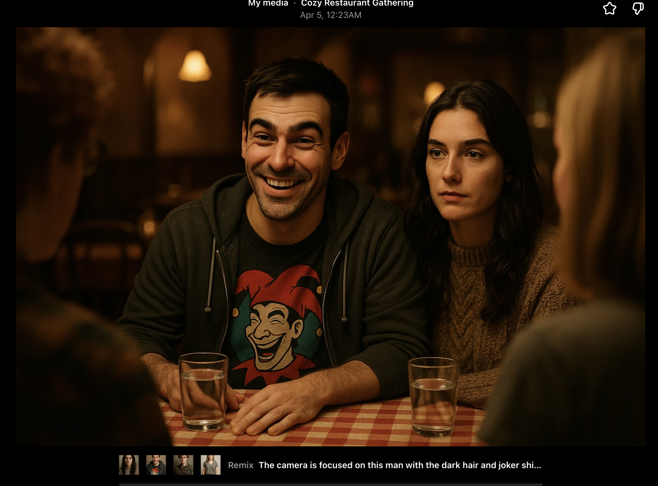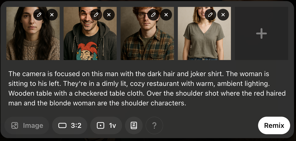 I had one of these pics for each of the main characters + the waitress. From there, these were the pictures I plugged into ChatGPT or Sora again to get each camera angle or “scene”.